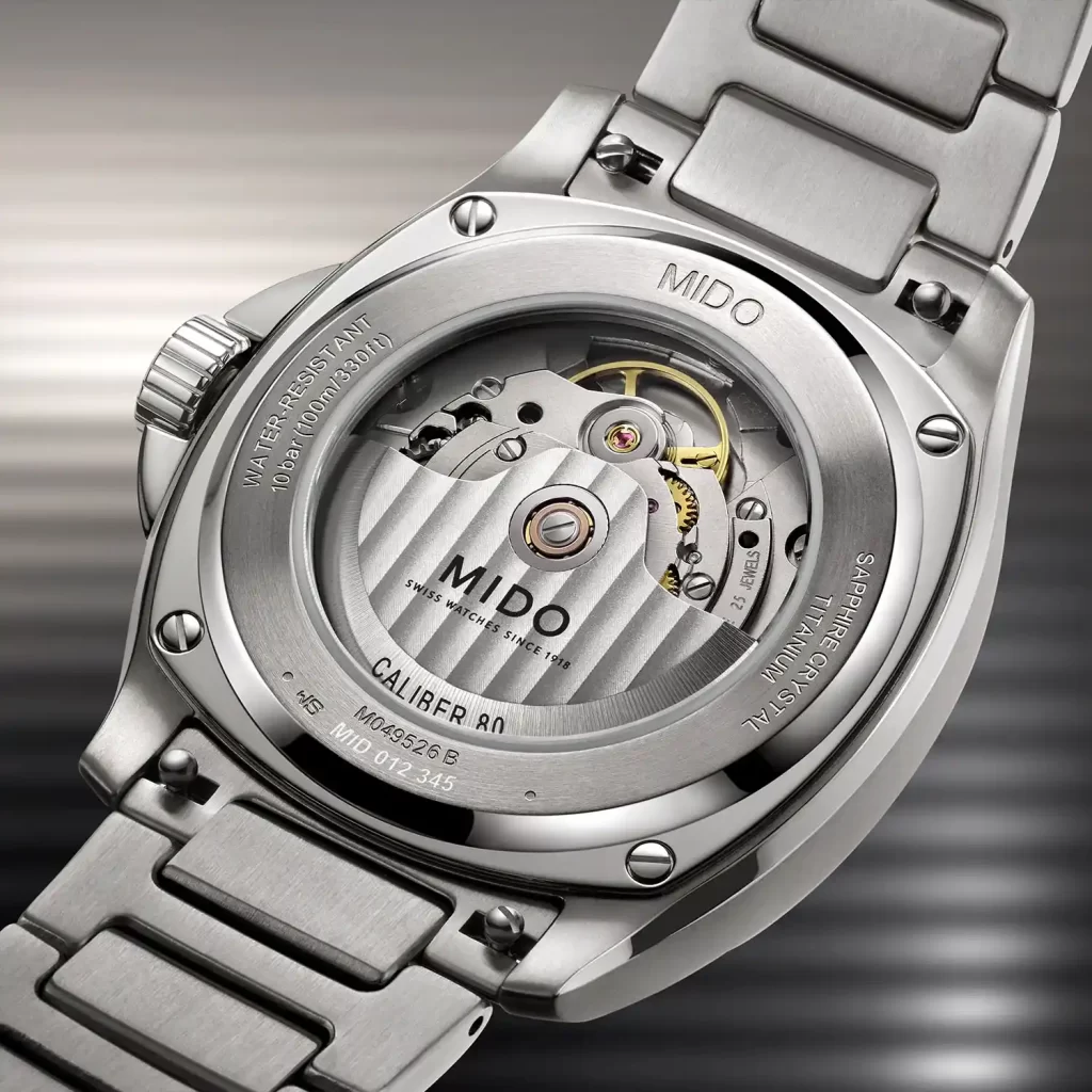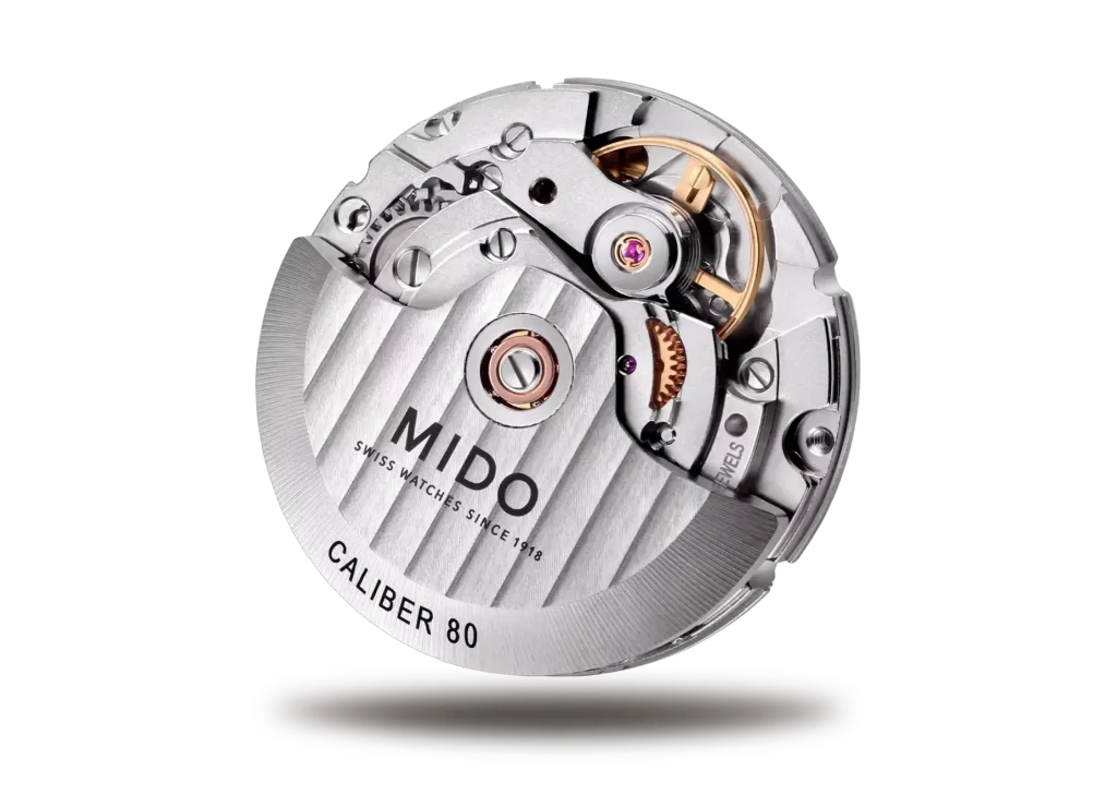 Caracteristici mecanism | Spiră de balans Nivachron rezistentă la șocuri și antimagetică, rezervă de mers 80 ore, rotor Mido personalizat cu striuri Geneva |